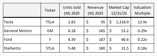 Tesla is valued like a growth tech platform at ~14× revenue multiple at year-end 2025, versus ~0.2–0.3× for the large auto manufacturers in the table below. Even though the incumbents sell 3–4× more vehicles than Tesla, their equity markets price them like cyclical manufacturers, not software-led growth businesses.